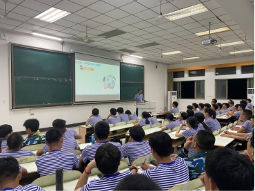 大一新生参加了学校军训工作部开展的安全教育课。课上由四位警官向学生们讲授安全教育知识。