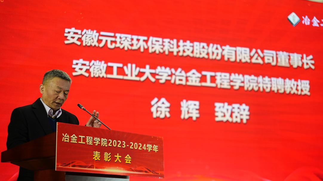 徐辉代表安徽元琛环保科技股份有限公司致辞,对学院长期关心支持企业发展表示感谢,对获奖师生表示祝贺,并分享了自身的科技创新、技术研究的成果和经验,希望进一步深化校企产学研合作,实现企业、师生多方共赢,欢迎更多的冶金学子加入元琛,实现新一代青年的强国梦。