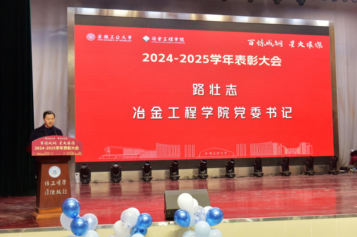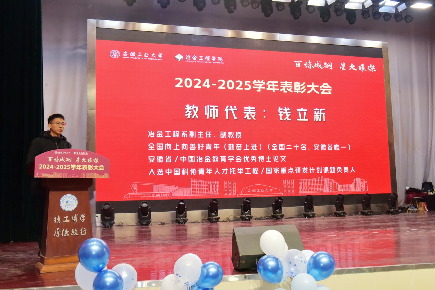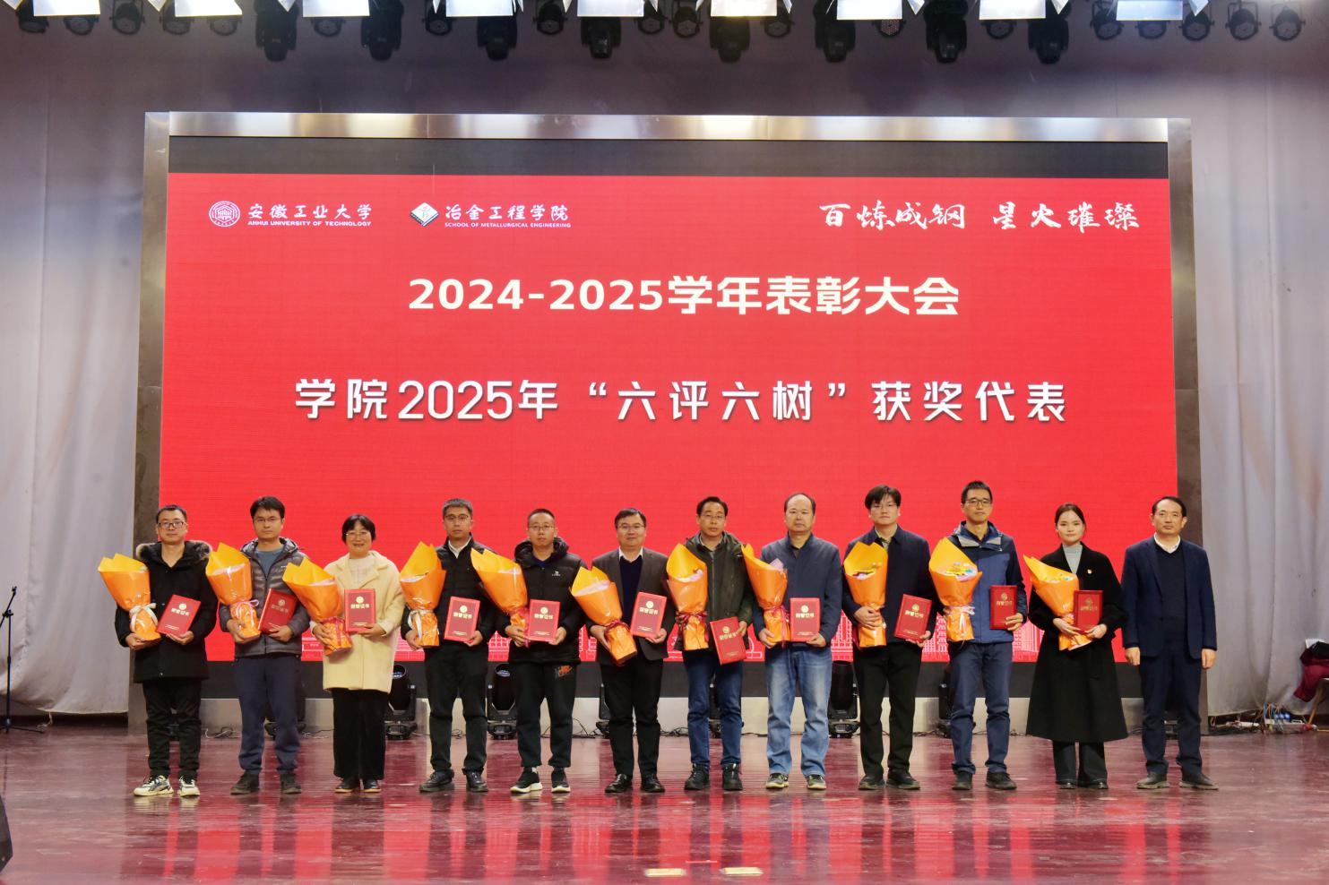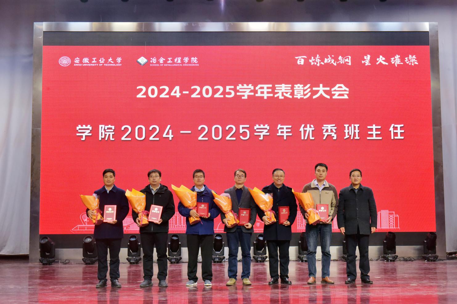 党委书记路壮志宣读了表彰通报。校先进班级型223班的黄诗云、张天乐讲述了班级建设的事迹与成果;国家奖学金获得者、冶243班汪静萱分享了从懵懂新生蜕变为专业第一的成长感悟;获奖教师代表、冶金工程系钱立新深情回顾了自己坚守育人初心的奋斗经历。与会领导为获奖先进集体和个人颁发了荣誉证书,学生代表向获奖老师献花致敬。