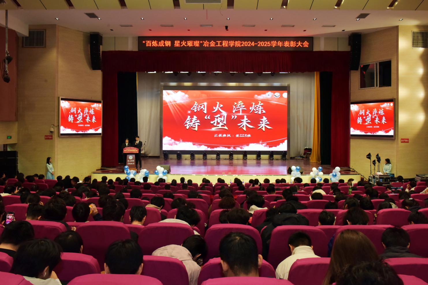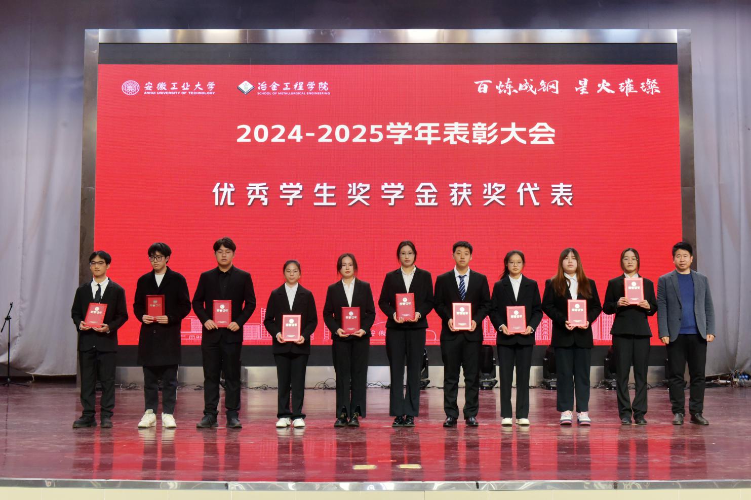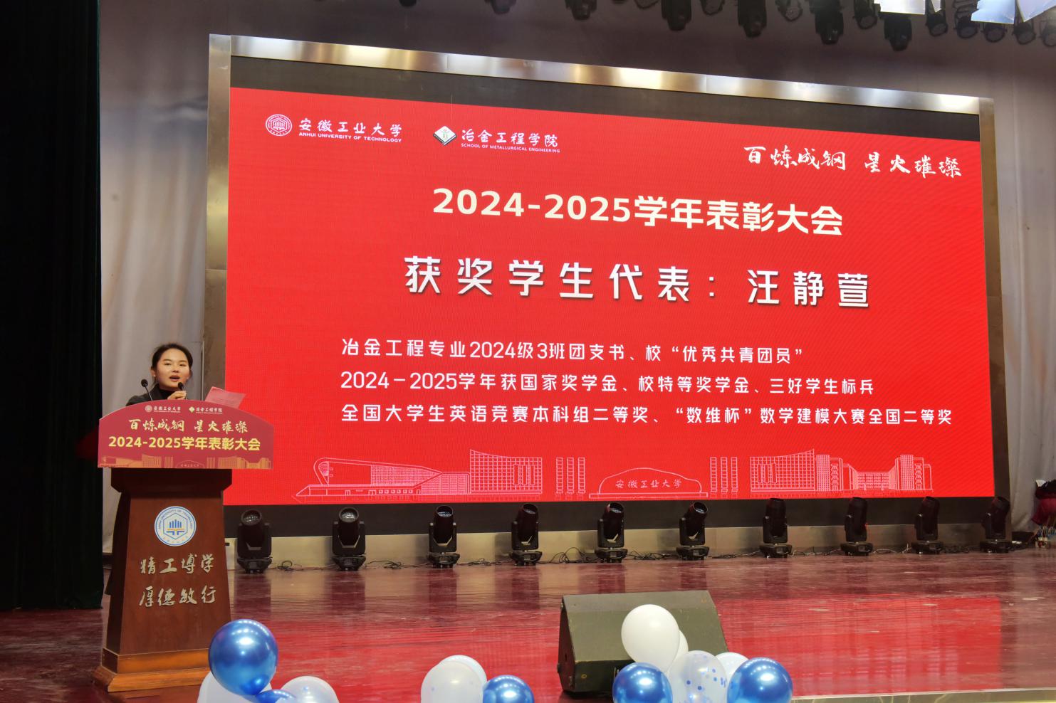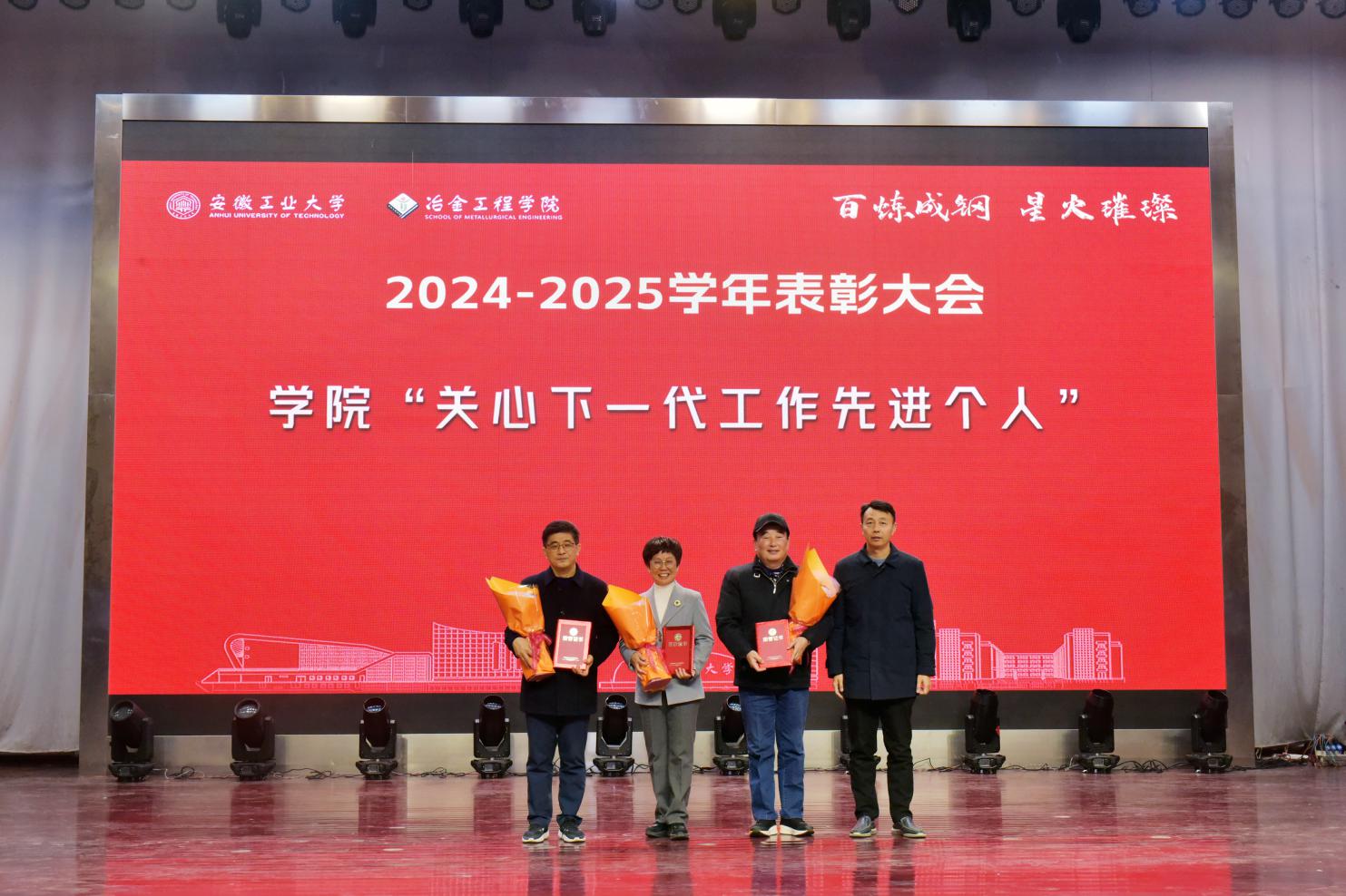 党委书记路壮志宣读了表彰通报。校先进班级型223班的黄诗云、张天乐讲述了班级建设的事迹与成果;国家奖学金获得者、冶243班汪静萱分享了从懵懂新生蜕变为专业第一的成长感悟;获奖教师代表、冶金工程系钱立新深情回顾了自己坚守育人初心的奋斗经历。与会领导为获奖先进集体和个人颁发了荣誉证书,学生代表向获奖老师献花致敬。