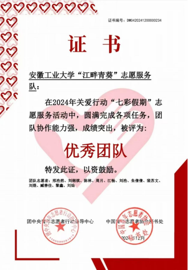 近日,团中央青年志愿者行动指导中心、中国青年志愿者协会秘书处公布了2024年关爱行动“七彩假期”志愿服务活动优秀团队名单,我“江畔青葵”志愿服务队获评优秀团队(全国前200)