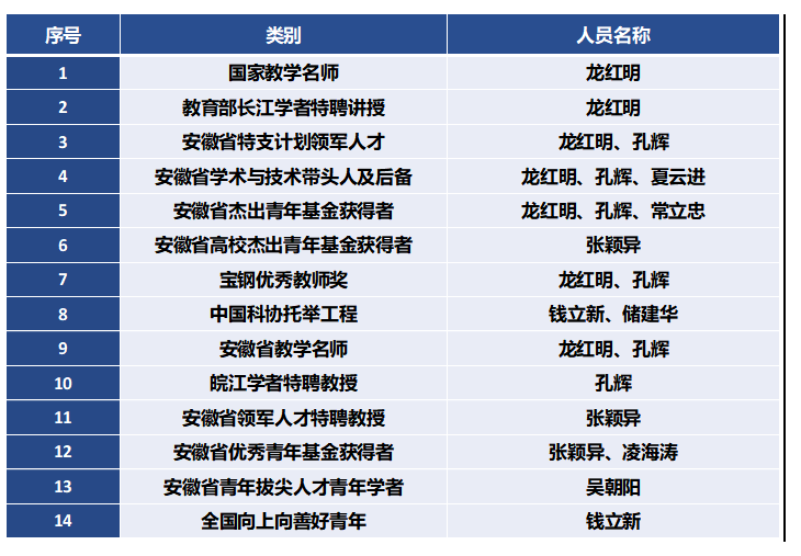 冶金工程系现有教师40人,具有博士学位37人,教授15人。其中国家级教学名师1人,教育部长江学者特聘讲授1人省学术与技术带头人2名及后备人选1人,获皖江学者、安徽省“特支计划”人才3人,安徽省领军人才特聘教授1人,安徽省青年拔尖人才青年学者1人,中国科协青年托举工程人才2人,安徽省战略新兴产业技术领军人才2人 4人获得“中国金属学会冶金青年科技奖”“冶金先进青年科技工作者”和“全国高校冶金院长奖”,1人获“钢铁工业优秀科技工作者”。安徽省教学名师、教坛新秀各2人, 2人获得宝钢优秀教师奖,3人获得安徽省杰青项目资助,1人获安徽省高校杰青项目资助,2人获省优青人才项目资助。目前,全系保持着团结协作、氛围宽松、师资结构合理的学术环境,拥有省级教研创新团队4个,校级科技创新团队和校级教学团队各2个。