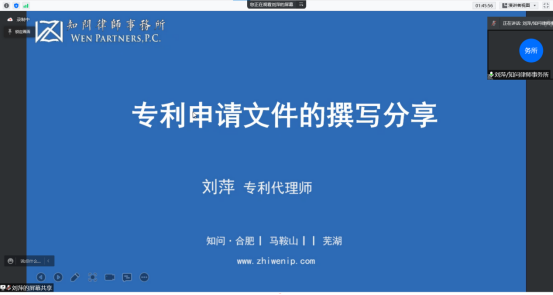 4月5日,咪咕视频 第17期创新创业训练营邀请安徽知问律师事务所专利代理师刘萍,给同学们线上进行题为《专利申请文件的撰写分享》的培训,培训由训练营班主任吴巍主持。