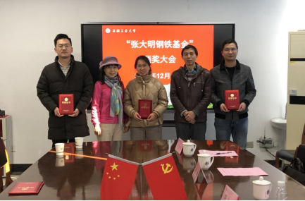 关于“张大明钢铁基金”奖教金、奖学金和助学金的通报》。张大明先生和朱洪斌女士共同为获奖师生和受资助学生进行颁奖。何世伟、许贝贝、鞠纳川分别作为获奖老师、获奖学生和受资助学生在会上发言。