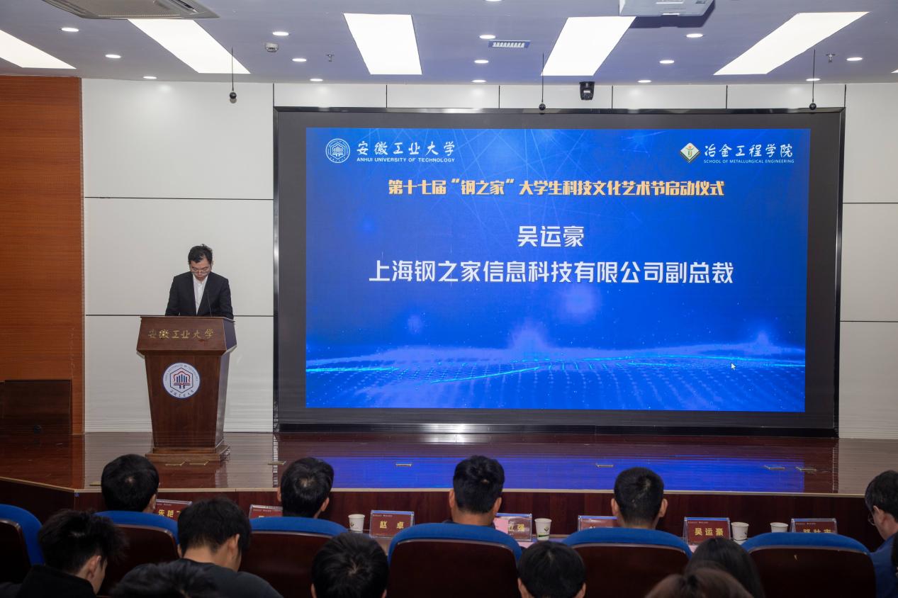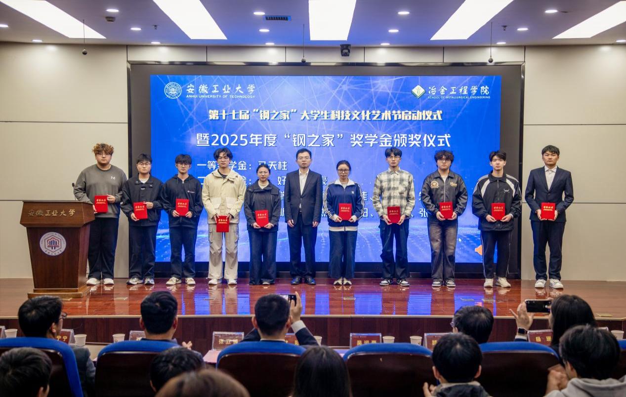 在秀山校区振华图书馆大明报告厅举行第十七届“钢之家”大学生科技文化艺术节启动仪式暨2025年度“钢之家”奖学金颁奖仪式。上海钢之家信息科技有限公司高级副总裁吴运豪、安徽钢之家电子商务有限公司副总经理杜郑、上海钢之家信息科技有限公司国际部主管杨珊、院领导、各系负责人及师生代表参加了本次活动。