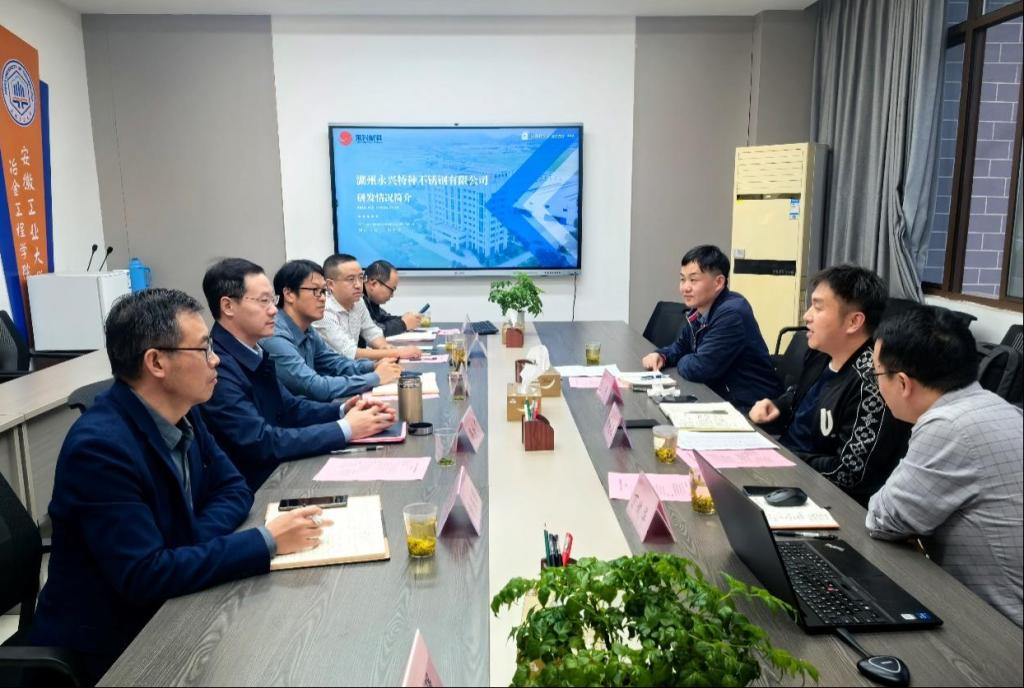 顾晓暾从企业发展、产品特色等方面介绍了永兴特种材料科技股份有限公司相关情况,表达了与安徽工业大学进行深度长期的产学研合作意向。丁斌华和朱伟分别介绍了企业产品技术研发和人力资源等方面情况。