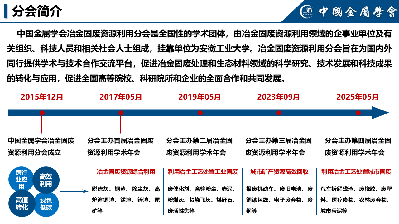 中国金属学会冶金固废资源利用分会是全国性的学术团体,由冶金固废资源利用领域的企事业单位及有关组织、科技人员和相关社会人士组成,挂靠单位为安徽工业大学。冶金固废资源利用分会旨在为国内外同行提供学术与技术合作交流平台,促进冶金固废处理和生态材料领域的科学研究、技术发展和科技成果的转化与应用,促进全国高等院校、科研院所和企业的全面合作和共同发展。