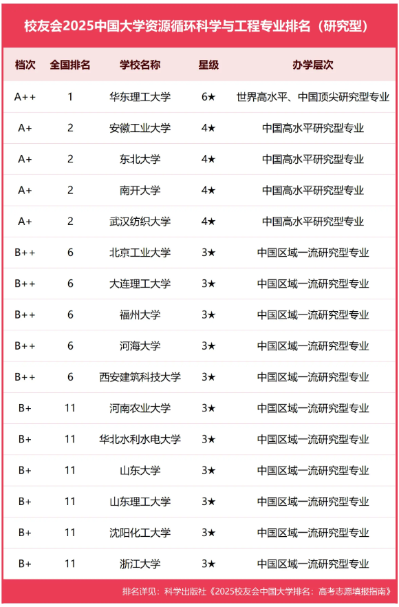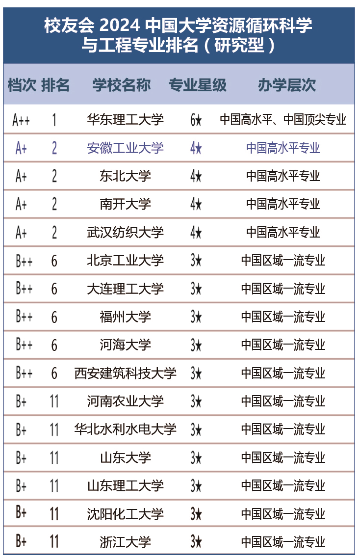 近期,在全国第三方大学评价机构艾瑞深校友会网正式公布的《2025校友会中国大学排名:高考志愿填报指南》中,我院资源循环科学与工程专业位居A+档次,连续三年排名全国第二。